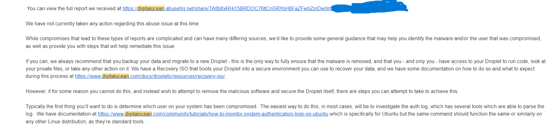 While I wasn’t exactly expecting my little side project to be launching an attack, I have to honestly admit when I read “it’s likely that your Droplet has been compromised” - I almost soiled myself.